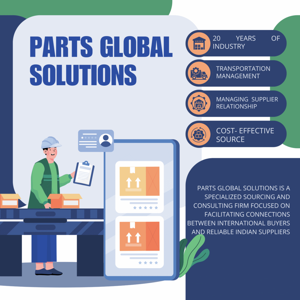 Parts Global Solutions is a specialized sourcing and consulting firm dedicated to connecting international buyers with reliable Indian suppliers. With over 20 years of industry expertise, we facilitate seamless global sourcing, ensuring quality, competitive pricing, and timely delivery.
